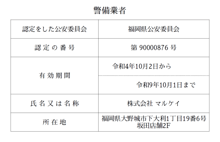 会社概要 Outline 私長年の経験と信頼性をもとに、高品質な警備サービスを提供します。 私たちの提供するサービスは安全と安心です。私たちは常に、起こりうる危険を想定し、それを未然に防ぐことで、お客様や社会の皆さまに「今日一日、何事もなかった」と当たり前に感じていただけること、そしてそれを陰から支えていることに誇りを感じています。そのため、弊社では責任感・向上心・協調性を重視し、より質の高いサービスをご提供できるよう、従業員教育や働き方の改善など、職場環境の整備に努めております。「安全・安心」という目に見えないものを商品としているからこそ、お客様や社会からの信用・信頼を第一に考え、日々の業務に取り組んでおります。また、弊社では「一隅を照らす」の精神のもと、「雇用による社会貢献」を企業理念の一つに掲げています。それぞれのライフワークや「仕事をする目的」の多様性を尊重し、すべての従業員が、弊社で働くこと(あるいは働いていたこと)に価値を感じられる職場づくりを行っております。今後も、皆さまがさまざまな形で弊社と関わっていただけるよう、誠心誠意取り組んでまいりますので、何卒よろしくお願い申し上げます。 代表取締役 岩永 亮太 会社名 株式会社マルケイ 本社 住所:福岡県大野城市下大利1丁目19番6号2FTEL:092-980-2473 筑紫野営業所 住所:福岡県筑紫野市針摺西1丁目4番2号2FTEL:092-555-2583 設立 2017年 代表者 代表取締役 岩永亮太 事業内容 交通誘導警備,イベント警備,店舗駐車での車両誘導 警備業認定番号 福岡県公安委員会 第9000876号 加盟団体 福岡県警備協会福岡県警備業政治連盟大野城商工会 標識 Sign
